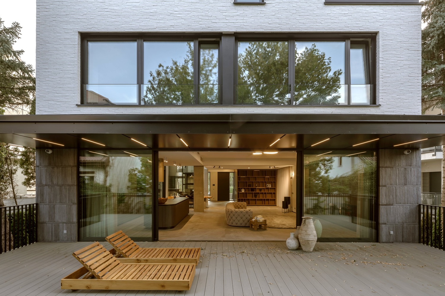 Architekci nadali budynkowi klarowną, modernistyczną formę, ale przełamali jej monolityczność subtelnym rytmem materiałów. Elewacja została wykończona betonową płytką w dwóch odcieniach - bieli i grafitowej szarości - układaną bezfugowo i nieregularnie, w układzie pionowym i poziomym. Horyzontalne pasy rozciągają bryłę optycznie, podczas gdy pionowe akcenty podkreślają jej wertykalny charakter. To dialog dwóch kierunków - równowaga pomiędzy porządkiem a dynamiką. Układ okien konsekwentnie odzwierciedla funkcje pomieszczeń. Poziome przeszklenia w strefach mieszkalnych otwierają się na ogród, a wąski, pionowy pas okien prowadzący wzdłuż klatki schodowej podkreśla wewnętrzną oś domu. Zewnętrzne żaluzje zapewniają kontrolę światła i prywatność, dopełniając charakter tej eleganckiej, powściągliwej bryły.