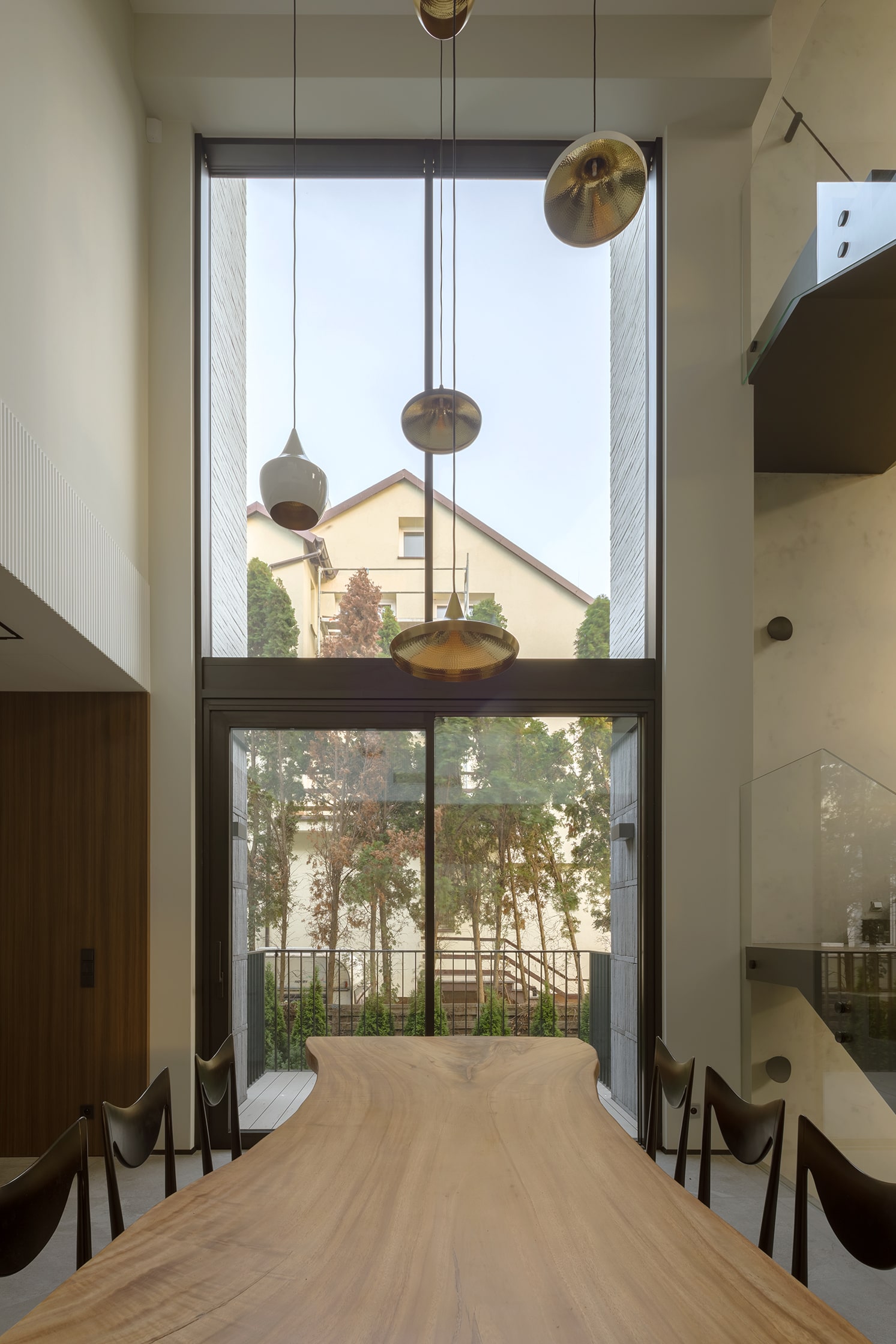 Architekci z Exterio Architektura zaprojektowali budynek jako klarowny, wertykalny układ przestrzeni, w którym każda kondygnacja ma swoje ściśle określone zadanie. W podziemiu zlokalizowano garaż na kilka stanowisk oraz pomieszczenia techniczne, które stanowią zaplecze codziennego funkcjonowania. Parter to otwarta, dzienna strefa życia - przestrzeń bez ścian, w której kuchnia, jadalnia i salon przenikają się wzajemnie, tworząc jedno, dynamiczne wnętrze. Przeszklona ściana otwiera tę strefę na taras, który biegnie aż do granicy działki, stanowiąc płynne przedłużenie salonu i wprowadzając światło głęboko do środka. Dwukondygnacyjna przestrzeń nad jadalnią otwarta na południe wysokim przeszkleniem nadaje wnętrzu zróżnicowanej formy oraz łączy z kondygnacją powyżej. Na wyższych kondygnacjach ulokowano prywatne części domu - pierwsze piętro z pokojami dzieci oraz najwyższy poziom przeznaczony dla rodziców. Master bedroom z prywatnym tarasem i widokiem ponad dachami sąsiednich domów stanowi najbardziej intymną przestrzeń budynku.