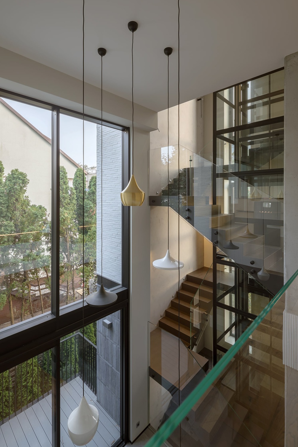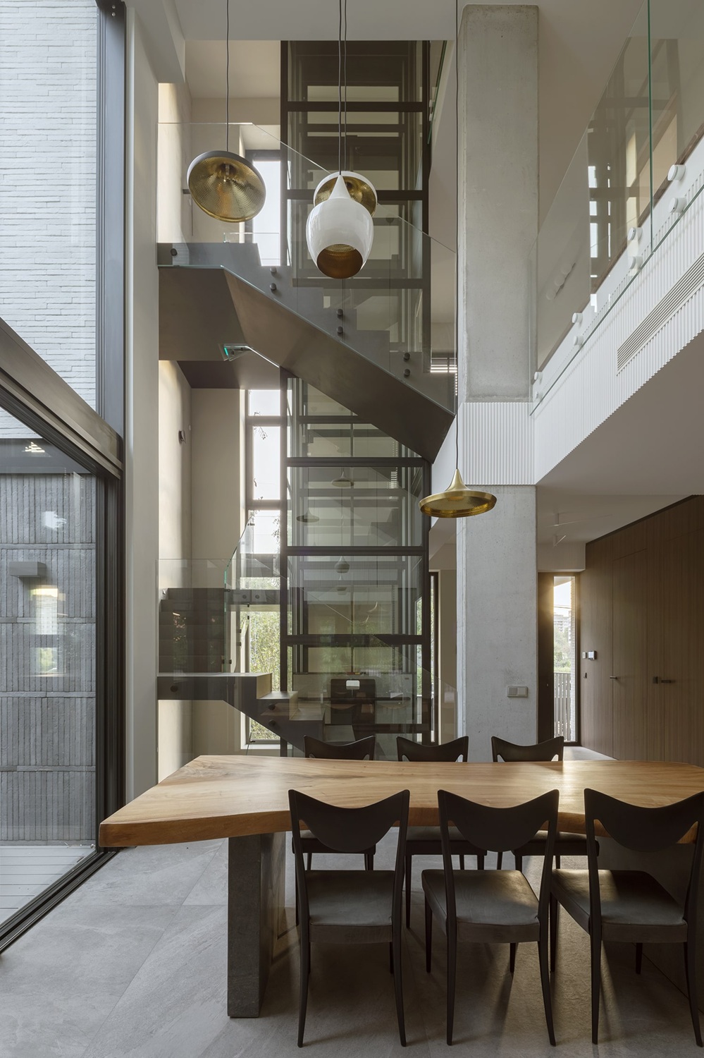 Centralny szyb windowy, wykonany z transparentnego szkła, nie został ukryty - przeciwnie, stał się jednym z kluczowych elementów kompozycyjnych wnętrza. Wokół niego zorganizowano cały pion komunikacyjny, a schody o lekkiej, ażurowej konstrukcji dodają przestrzeni dynamiki. Takie rozwiązanie pozwala światłu swobodnie przenikać między kondygnacjami, dzięki czemu wnętrza zmieniają się w rytmie dnia - od porannej miękkości po ciepłą poświatę wieczoru. W tej grze pionu, światła i funkcji kryje się istota koncepcji „Domu Wertykalnego” - domu, który zachowując zwartą formę, pozostaje przestrzenny, lekki i otwarty.