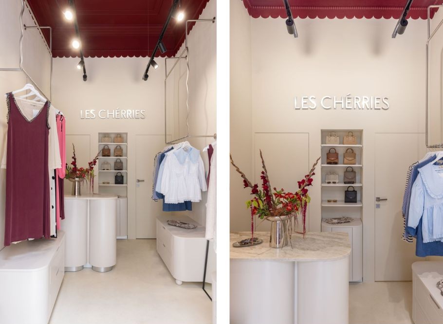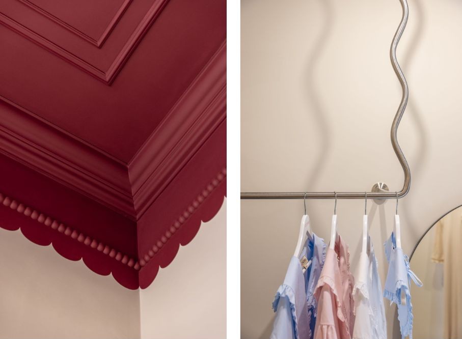 Uwagę przyciąga bordowy sufit – kolor zaczerpnięty z identyfikacji wizualnej marki Les Cherries – wraz z dekoracyjną sztukaterią. Pojawiają się tam także drobne „kuleczki”, których wykonanie, jak wspominają projektantki, nie należało do najłatwiejszych. To właśnie sufit stanowi kluczowy element butiku, podczas gdy pozostałe części wnętrza tworzą dla niego spokojne tło. Kolejnym interesującym detalem są wykonane na zamówienie wieszaki o falistej formie. To właśnie takie elementy, jak sztukateria, kuleczki, subtelne zdobienia i motywy fal przemycają do wnętrza nutę romantyzmu.