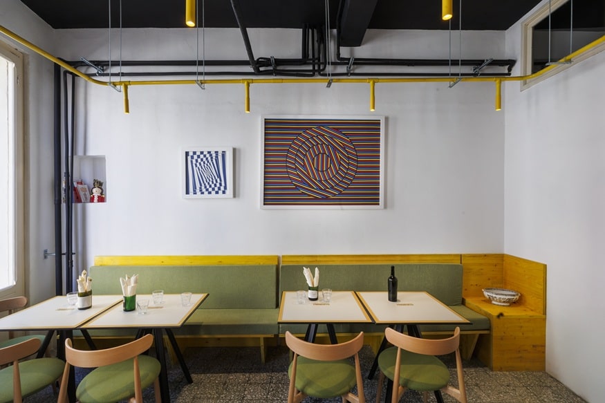 Aranżacja zdominowana została przez intensywny odcień żółci. Kolor ten dumnie prezentuje się między innymi na ścianach, balustradach czy detalach instalacyjnych. Tym samym stanowi on nie tylko dodatek, ale odważny motyw przewodni podkreślający rytm i charakter wnętrza. Całość sparowano z zielenią tapicerowanych siedzisk i neutralnością surowych ścian. Zastosowane barwy nie są dziełem przypadku. Stanowią bowiem świadomy zabieg architektów, którzy potraktowali wnętrze niczym płótno, na którym mocne akcenty barwne porządkują przestrzeń i wyznaczają jej dynamikę. Między innymi, dzięki temu lokal wyróżnia się na tle konkurencji, bez obaw o to, iż zginie w gąszczu podobnych lokali.