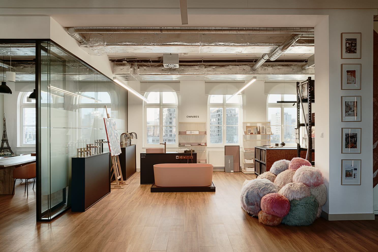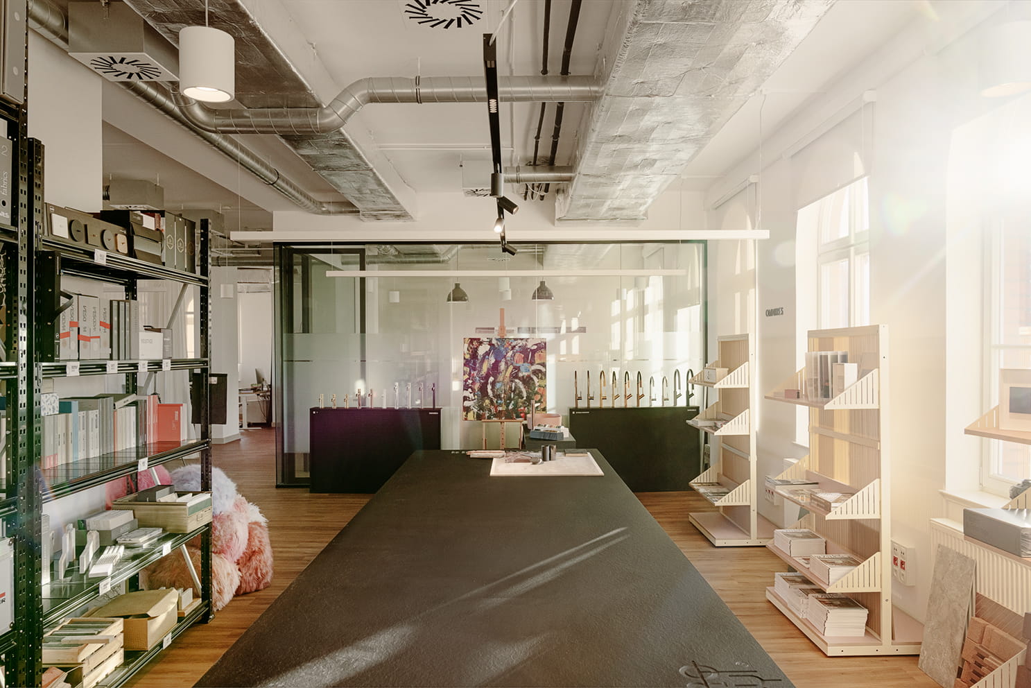 Blisko 300 m² wypełnia otwarta, wielofunkcyjna przestrzeń przygotowana z myślą o spotkaniach, prezentacjach i pracy koncepcyjnej. Centralna część została zaprojektowana jak elastyczna scena wydarzeń – z miejscem na rozmowy, ekspozycje partnerów oraz laboratorium materiałów, przy dużym stole, gdzie projektanci mogą dosłownie „pracować na detalach”. Obok znajduje się osobna sala konferencyjna oraz kameralna strefa kreatywna, z której na co dzień korzysta pracownia SIKORA Creative Architecture, nadając miejscu realny rytm pracy twórczej.