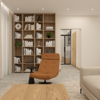 Projekt salonu z jadalnią. Fornirowana ściana tv w salonie, tapcierowane meble wypoczynkowe i duży, drewniany stół.