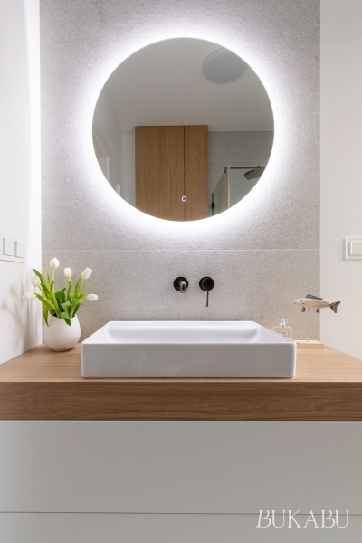 Nowoczesna łazienka przy sypialni rodziców została zaprojektowana z myślą o ergonomii, funkcjonalności i i estetyce. Wnęrze wyrónia duże okno tarasowe, które doświetla przestrzeń i optycznie ją powięsza. Mimo niewielkiego metrażu łazienka mieści przestronny prysznic, toaletę myjącą, wygodną umywalkę nablatową oraz praktyczną zabudowę do przechowywania. Zastosowano eleganckie płytki 120x120 cm w ciepłej popielatej tonacji oraz drewnianą okleinę, które tworzą harmonijny, nowoczesny wystrój. Armatura w kolorze hard graphite dopełnia całość, zapewniając spójny, stylowy efekt. Kabina prysznicowa od innego producenta została dobrana w identycznym kolorze okuć jak armatura, co podkreśla spójność projektu. To idealna inspiracja dla osób poszukujących pomysłu na małą, funkcjonalną łazienkę.
