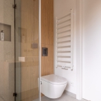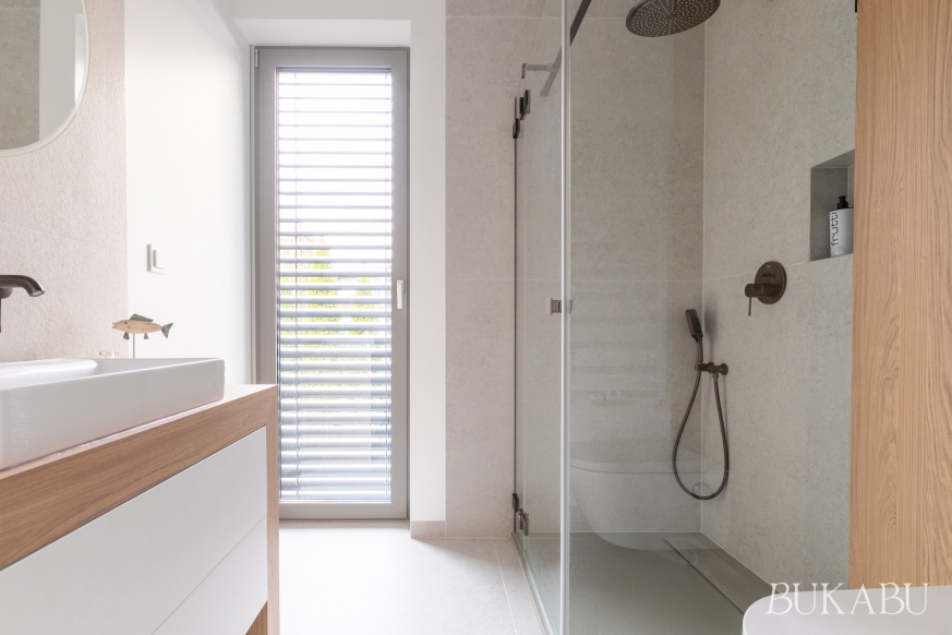 Nowoczesna łazienka przy sypialni rodziców została zaprojektowana z myślą o ergonomii, funkcjonalności i i estetyce. Wnętrze wyróżnia duże okno tarasowe, które doświetla przestrzeń i optycznie ją powięsza. Mimo niewielkiego metrażu łazienka mieści przestronny prysznic, toaletę myjącą, wygodną umywalkę nablatową oraz praktyczną zabudowę do przechowywania. Zastosowano eleganckie płytki 120x120 cm w ciepłej popielatej tonacji oraz drewnianą okleinę, które tworzą harmonijny, nowoczesny wystrój. Armatura w kolorze hard graphite dopełnia całość, zapewniając spójny, stylowy efekt. Kabina prysznicowa od innego producenta została dobrana w identycznym kolorze okuć jak armatura, co podkreśla spójność projektu. To idealna inspiracja dla osób poszukujących pomysłu na małą, funkcjonalną łazienkę.