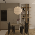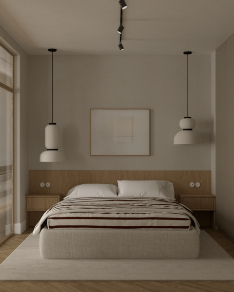 Łóżko z fornirowanym zagłówkiem z szafkami nocnymi i kultowe lampy &Tradition. Przemyślane detale, które tworzą wnętrze z duszą.