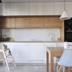 Otwarta kuchnia w stylu skandynawskim połączona z salonem. Mieszkanie jest w stonowanej kolorystyce grze dominuje biel, ocieplone drewnem.