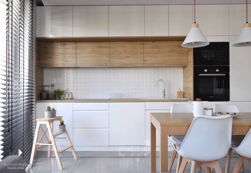Otwarta kuchnia w stylu skandynawskim połączona z salonem.