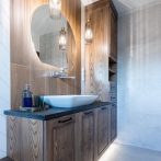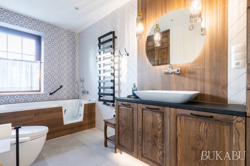 W aranżacji zastosowano cztery rodzaje płytek: kamiennopodobne, drewnopodobne, cegiełki oraz dekoracyjne płytki patchworkowe, które w połączeniu z ciemnym drewnem tworzą ciepłe, ponadczasowe wnętrze. Meble łazienkowe wykonano na zamówienie z litego drewna, z detalami inspirowanymi zabytkowymi szafkami należącymi do prababci właścicielki.