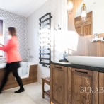 W aranżacji zastosowano cztery rodzaje płytek: kamiennopodobne, drewnopodobne, cegiełki oraz dekoracyjne płytki patchworkowe, które w połączeniu z ciemnym drewnem tworzą ciepłe, ponadczasowe wnętrze. Meble łazienkowe wykonano na zamówienie z litego drewna, z detalami inspirowanymi zabytkowymi szafkami należącymi do prababci właścicielki.