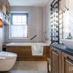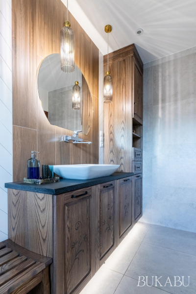 W aranżacji zastosowano cztery rodzaje płytek: kamiennopodobne, drewnopodobne, cegiełki oraz dekoracyjne płytki patchworkowe, które w połączeniu z ciemnym drewnem tworzą ciepłe, ponadczasowe wnętrze. Meble łazienkowe wykonano na zamówienie z litego drewna, z detalami inspirowanymi zabytkowymi szafkami należącymi do prababci właścicielki.
