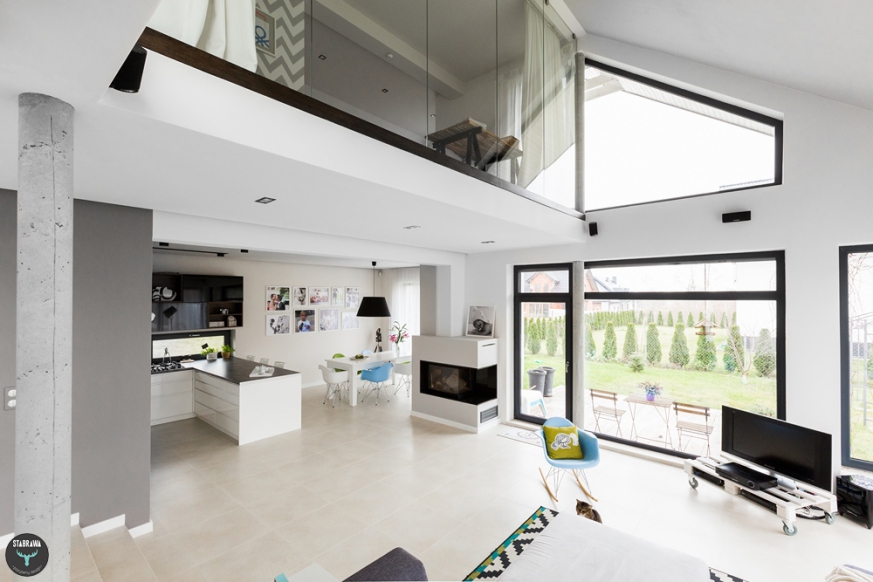 salon z widoczną sypialnią na piętrze
