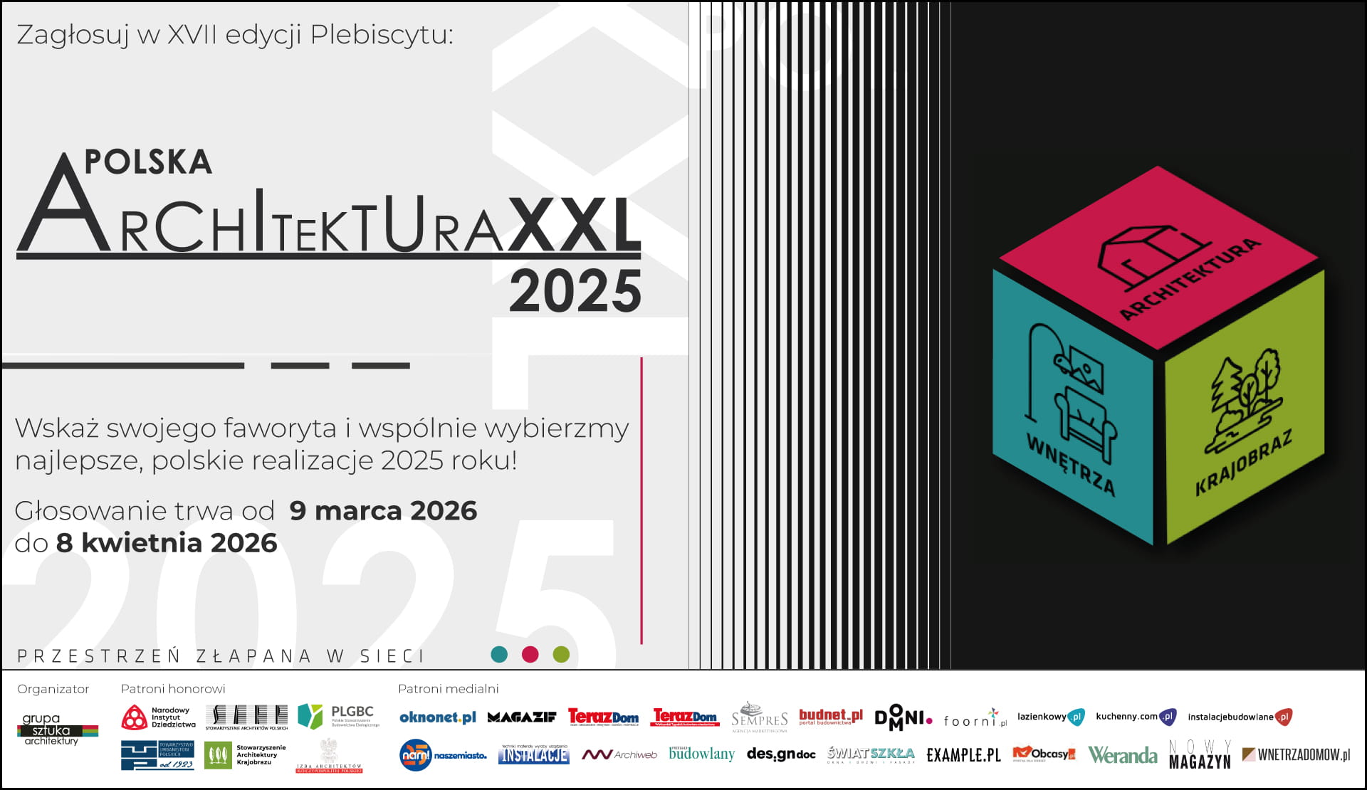 Jak co roku zwycięzcy zostaną wyłonieni w dwóch ścieżkach: poprzez głosowanie publiczności oraz decyzję profesjonalnego jury. Głosowanie internautów trwa do 8 kwietnia 2026 roku do końca dnia. Zachęcamy do zapoznania się z nominowanymi realizacjami i oddania głosu na projekt, który Waszym zdaniem najlepiej oddaje ducha współczesnej polskiej architektury. Plebiscyt Polska Architektura XXL to najbardziej kompleksowy przegląd aktywności polskiej branży architektonicznej. W jego ramach realizacje są wybierane w trzech dziedzinach: kubatura, wnętrza i krajobraz, każda podzielona na dwie kategorie - obiekty publiczne i prywatne. Zostanie też przyznana nagroda Grand Prix.
